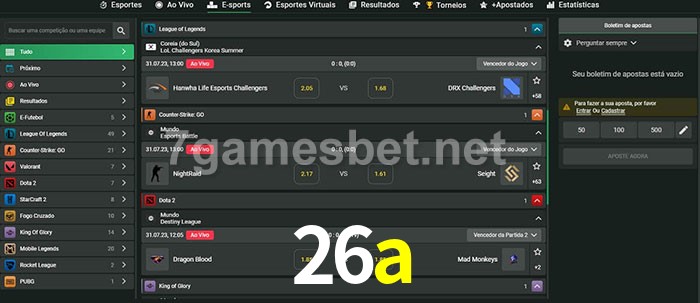 O 26a oferece uma grande seleção de opções de apostas em e-sports com probabilidades competitivas